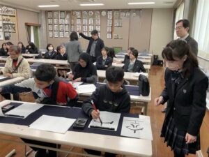 まずは「漢字クイズ」で、漢字の意味を楽しく学習。その後、実際に筆を手に取り、初めての書道に挑戦しました。部員たちが英語を交えて丁寧にサポートし、一人ひとり個性が光る、世界に一つだけの作品を書き上げました。